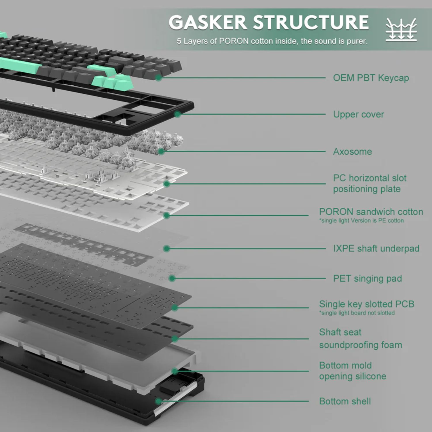 Cấu trúc & giảm âm: Gasket mount kết hợp 5 lớp foam tiêu âm (PORON, IXPE pad, PET noise pad, EPDM, silicone pad) cho trải nghiệm gõ êm, đầm.