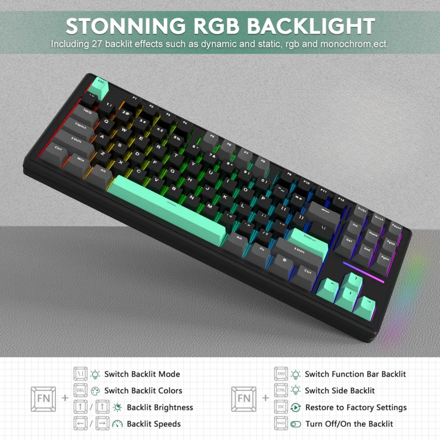 Keycaps: chất liệu PBT, in bên hông (side-printed), thiết kế gradient, hỗ trợ xuyên sáng LED.