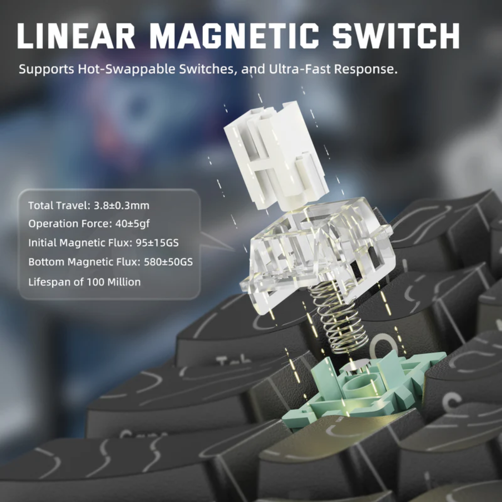 Các tính năng được hỗ trợ : Rapid Trigger (RT), Snap tap, Dynamic Keystrokes (DKS), Mod-Tap (MT), Toggle Key (TGL)