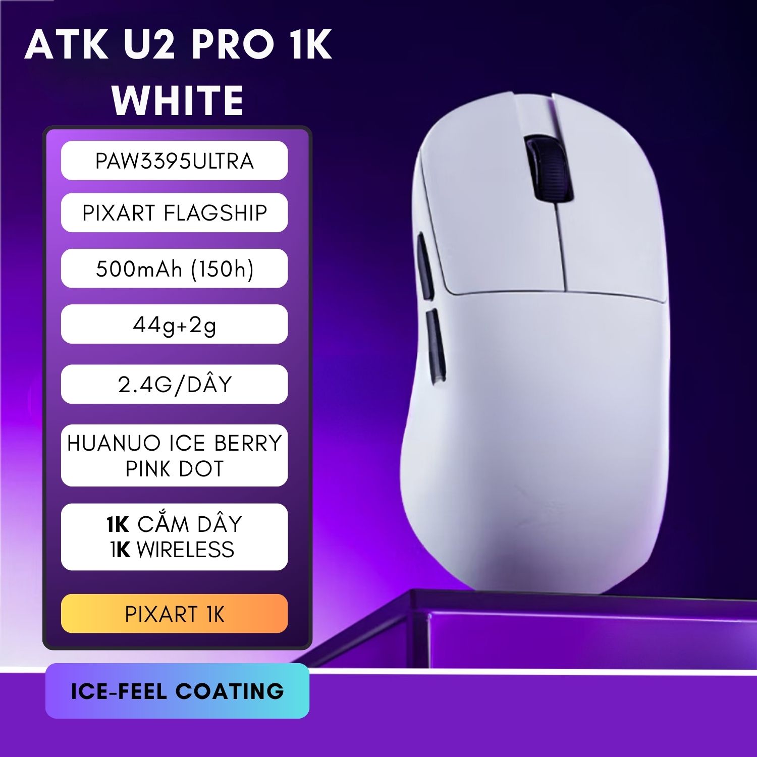 CHUỘT ATK U2 PRO 1K MULTI MODES WHITE (PAW3395ULTRA/44G)